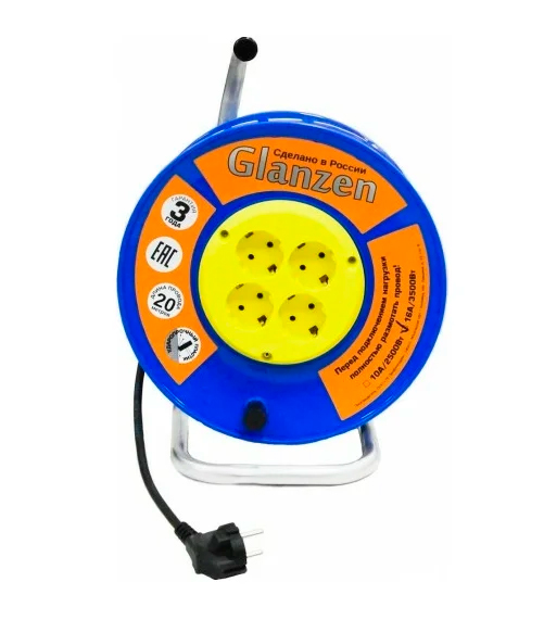 Удлинитель силовой на катушке GLANZEN 4 гн. ПВС 3х1,5 20м Артикул: EB-20-019 Код: УТ-00102390